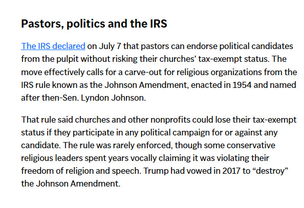 2) To be clear pastors WERE doing this already. I said for years we needed to fine or disband churches that do this but nobody had the will to do it. Many pastors were and still are pro Trump or republican party GOP right wing etc. Some are Left but that’s why we have Separation of Church and State