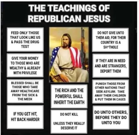 But Republican Jesus doesn’t care about the poor, the sick, the immigrants (your neighbors) among us. They don’t care about sick children with cancer and lukemia. They don’t care about anything but enriching themselves and giving the richest people in our soceity even more money. If Jesus was here today He would be flipping tables angry just like He was when He enountered people doing business in the temple. Shame on you if you call yourself a Christian and you don’t care about the health and safety of our children, or our poor, of our sick, of the immigrants among us. Shame on you! You are not Christ-like. You are in a cult. A sick and perverted cult that betrays the teachings of Jesus Christ while claiming to be of Christ.