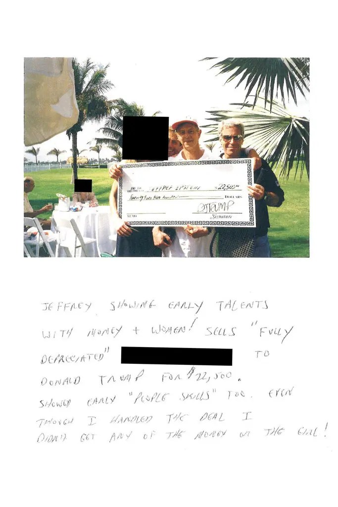 A photo of a novelty check suggesting Epstein ‘sold’ Trump a woman for $22,500: